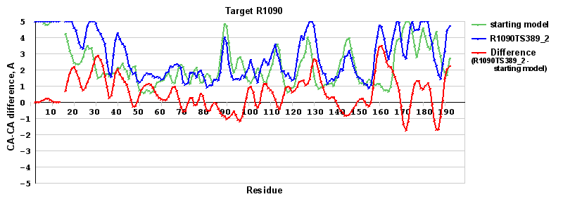 | Red line = (blue line) - (green thick line): difference between the corresponding Refined Model-Target and Starting Model-Target CA-CA distances (see above). Negative values show regions where the reifned model has better fit to the target than the starting model, i.e. areas of potential improvement. |