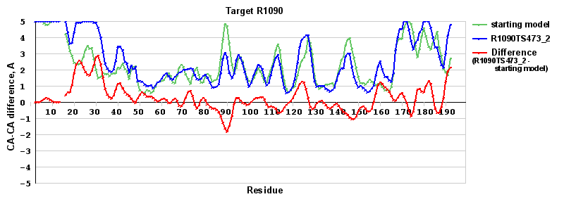 | Red line = (blue line) - (green thick line): difference between the corresponding Refined Model-Target and Starting Model-Target CA-CA distances (see above). Negative values show regions where the reifned model has better fit to the target than the starting model, i.e. areas of potential improvement. |