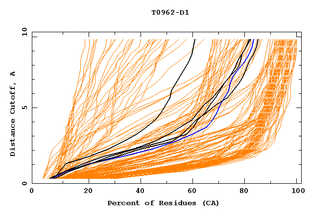 GDT analysis: largest set of CA atoms (percent of the modeled structure) that can fit under DISTANCE cutoff: 0.5A, 1.0A, 1.5A, ... , 10.0A