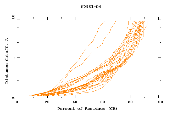 GDT analysis: largest set of CA atoms (percent of the modeled structure) that can fit under DISTANCE cutoff: 0.5A, 1.0A, 1.5A, ... , 10.0A