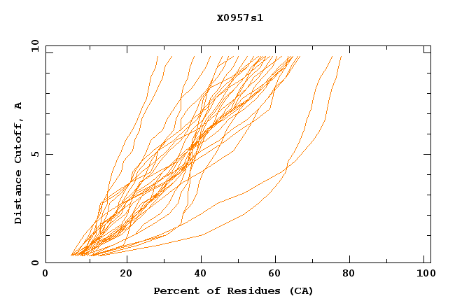 GDT analysis: largest set of CA atoms (percent of the modeled structure) that can fit under DISTANCE cutoff: 0.5A, 1.0A, 1.5A, ... , 10.0A
