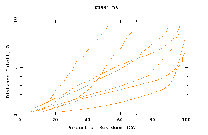 GDT analysis: largest set of CA atoms (percent of the modeled structure) that can fit under DISTANCE cutoff: 0.5A, 1.0A, 1.5A, ... , 10.0A