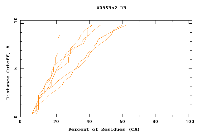 GDT analysis: largest set of CA atoms (percent of the modeled structure) that can fit under DISTANCE cutoff: 0.5A, 1.0A, 1.5A, ... , 10.0A