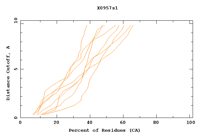 GDT analysis: largest set of CA atoms (percent of the modeled structure) that can fit under DISTANCE cutoff: 0.5A, 1.0A, 1.5A, ... , 10.0A