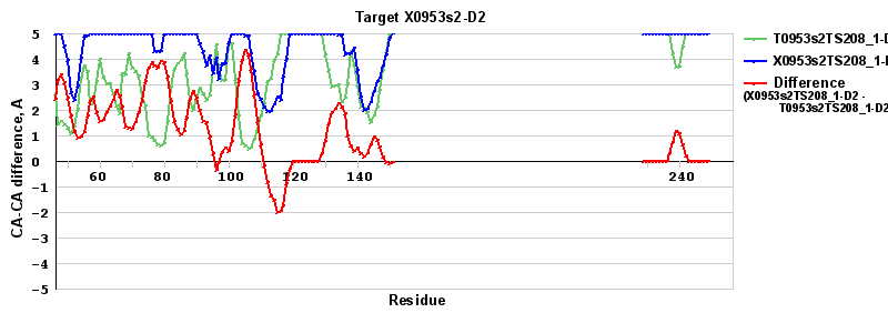 | Red line = (blue line) - (green thick line): difference between the corresponding "Assisted Model"-Target and "Regular Model"-Target CA-CA distances (see above). Negative values show regions where the "assisted" model has better fit to the target than the reference model, i.e. areas of potential improvement. |
