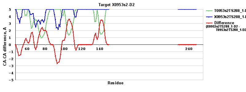 | Red line = (blue line) - (green thick line): difference between the corresponding "Assisted Model"-Target and "Regular Model"-Target CA-CA distances (see above). Negative values show regions where the "assisted" model has better fit to the target than the reference model, i.e. areas of potential improvement. |