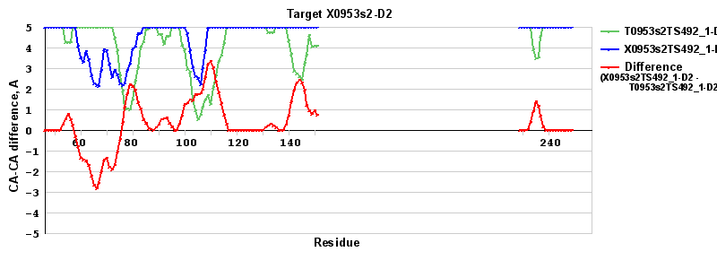 | Red line = (blue line) - (green thick line): difference between the corresponding "Assisted Model"-Target and "Regular Model"-Target CA-CA distances (see above). Negative values show regions where the "assisted" model has better fit to the target than the reference model, i.e. areas of potential improvement. |