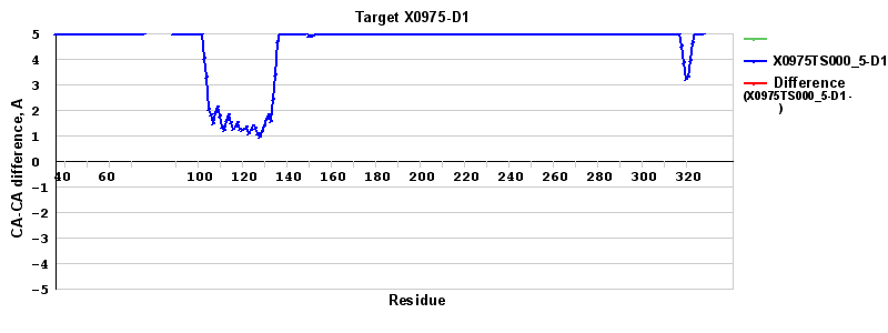 | Red line = (blue line) - (green thick line): difference between the corresponding "Assisted Model"-Target and "Regular Model"-Target CA-CA distances (see above). Negative values show regions where the "assisted" model has better fit to the target than the reference model, i.e. areas of potential improvement. |