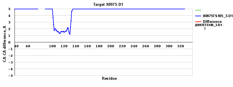 | Red line = (blue line) - (green thick line): difference between the corresponding "Assisted Model"-Target and "Regular Model"-Target CA-CA distances (see above). Negative values show regions where the "assisted" model has better fit to the target than the reference model, i.e. areas of potential improvement. |