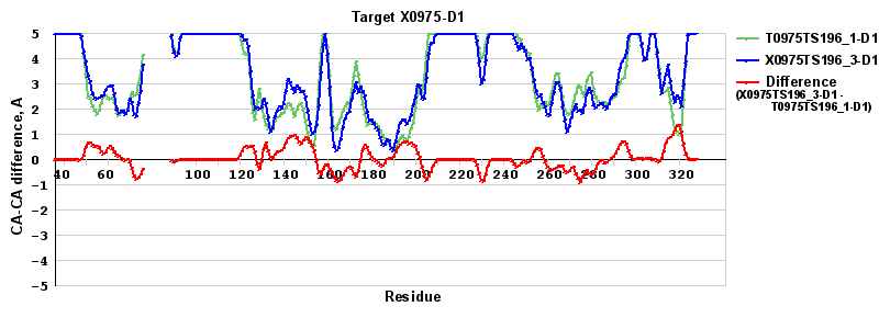 | Red line = (blue line) - (green thick line): difference between the corresponding "Assisted Model"-Target and "Regular Model"-Target CA-CA distances (see above). Negative values show regions where the "assisted" model has better fit to the target than the reference model, i.e. areas of potential improvement. |