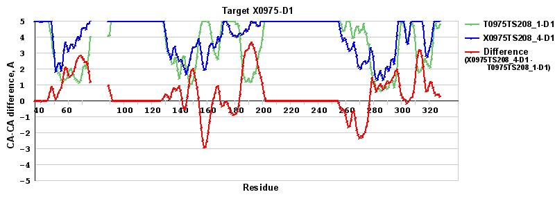 | Red line = (blue line) - (green thick line): difference between the corresponding "Assisted Model"-Target and "Regular Model"-Target CA-CA distances (see above). Negative values show regions where the "assisted" model has better fit to the target than the reference model, i.e. areas of potential improvement. |