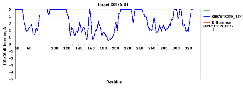 | Blue line: distance between the corresponding CA atoms in a "assisted model" and the experimental structure in the LGA sequence-independent superposition under the 4A distance cutoff. |