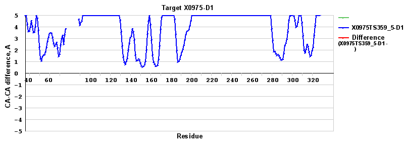 | Red line = (blue line) - (green thick line): difference between the corresponding "Assisted Model"-Target and "Regular Model"-Target CA-CA distances (see above). Negative values show regions where the "assisted" model has better fit to the target than the reference model, i.e. areas of potential improvement. |