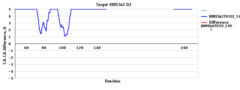 | Red line = (blue line) - (green thick line): difference between the corresponding "Assisted Model"-Target and "Regular Model"-Target CA-CA distances (see above). Negative values show regions where the "assisted" model has better fit to the target than the reference model, i.e. areas of potential improvement. |