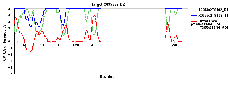 | Red line = (blue line) - (green thick line): difference between the corresponding "Assisted Model"-Target and "Regular Model"-Target CA-CA distances (see above). Negative values show regions where the "assisted" model has better fit to the target than the reference model, i.e. areas of potential improvement. |