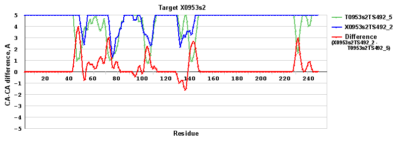 | Red line = (blue line) - (green thick line): difference between the corresponding "Assisted Model"-Target and "Regular Model"-Target CA-CA distances (see above). Negative values show regions where the "assisted" model has better fit to the target than the reference model, i.e. areas of potential improvement. |