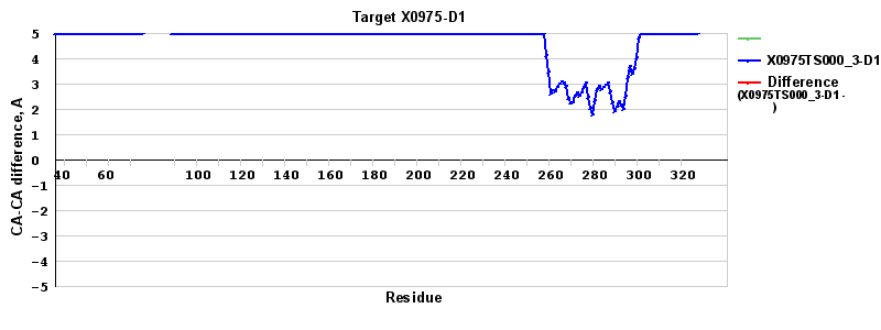 | Red line = (blue line) - (green thick line): difference between the corresponding "Assisted Model"-Target and "Regular Model"-Target CA-CA distances (see above). Negative values show regions where the "assisted" model has better fit to the target than the reference model, i.e. areas of potential improvement. |