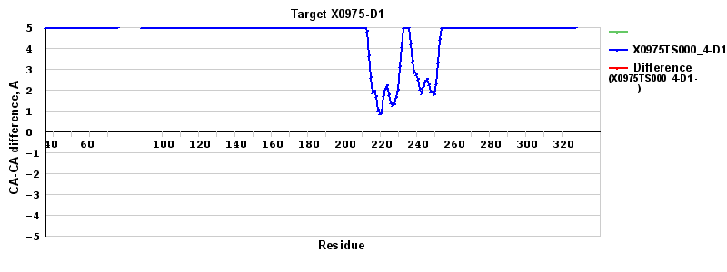| Red line = (blue line) - (green thick line): difference between the corresponding "Assisted Model"-Target and "Regular Model"-Target CA-CA distances (see above). Negative values show regions where the "assisted" model has better fit to the target than the reference model, i.e. areas of potential improvement. |