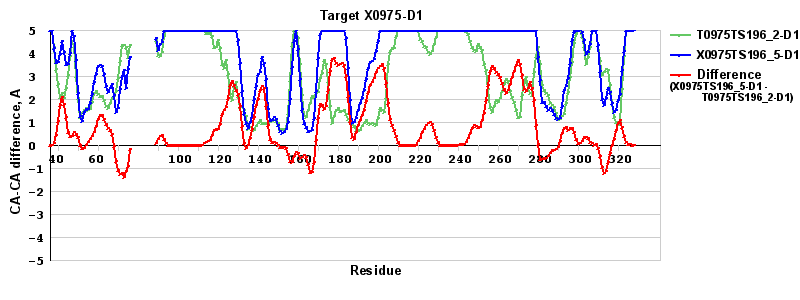 | Red line = (blue line) - (green thick line): difference between the corresponding "Assisted Model"-Target and "Regular Model"-Target CA-CA distances (see above). Negative values show regions where the "assisted" model has better fit to the target than the reference model, i.e. areas of potential improvement. |