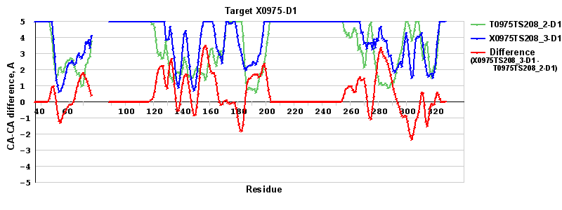 | Red line = (blue line) - (green thick line): difference between the corresponding "Assisted Model"-Target and "Regular Model"-Target CA-CA distances (see above). Negative values show regions where the "assisted" model has better fit to the target than the reference model, i.e. areas of potential improvement. |