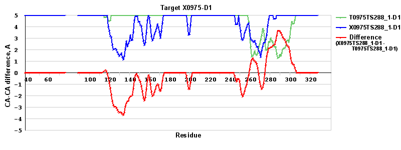 | Red line = (blue line) - (green thick line): difference between the corresponding "Assisted Model"-Target and "Regular Model"-Target CA-CA distances (see above). Negative values show regions where the "assisted" model has better fit to the target than the reference model, i.e. areas of potential improvement. |
