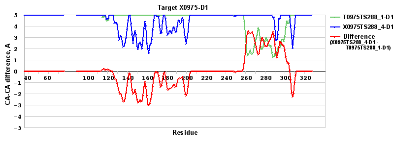 Red line = (blue line) - (green thick line): difference between the corresponding "Assisted Model"-Target and "Regular Model"-Target CA-CA distances (see above). Negative values show regions where the "assisted" model has better fit to the target than the reference model, i.e. areas of potential improvement.