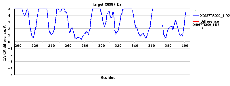 | Blue line: distance between the corresponding CA atoms in a "assisted model" and the experimental structure in the LGA sequence-independent superposition under the 4A distance cutoff. |