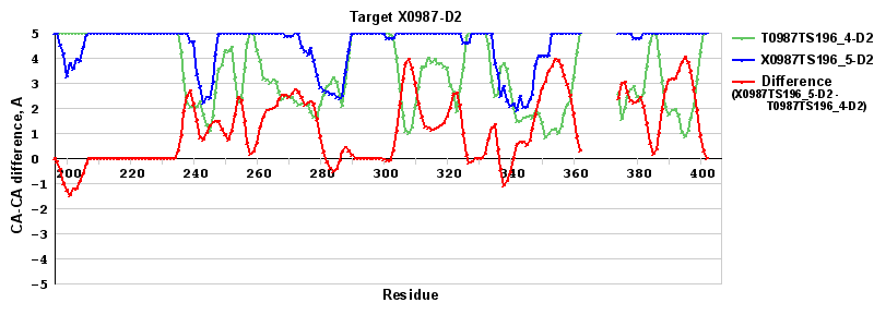 | Red line = (blue line) - (green thick line): difference between the corresponding "Assisted Model"-Target and "Regular Model"-Target CA-CA distances (see above). Negative values show regions where the "assisted" model has better fit to the target than the reference model, i.e. areas of potential improvement. |
