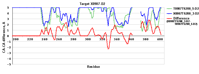 | Red line = (blue line) - (green thick line): difference between the corresponding "Assisted Model"-Target and "Regular Model"-Target CA-CA distances (see above). Negative values show regions where the "assisted" model has better fit to the target than the reference model, i.e. areas of potential improvement. |