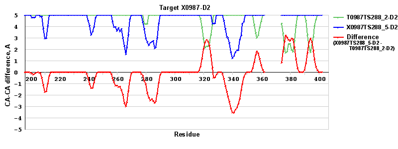 | Red line = (blue line) - (green thick line): difference between the corresponding "Assisted Model"-Target and "Regular Model"-Target CA-CA distances (see above). Negative values show regions where the "assisted" model has better fit to the target than the reference model, i.e. areas of potential improvement. |