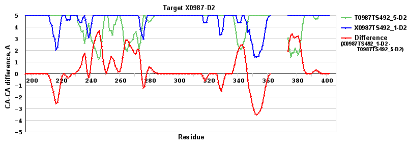 Red line = (blue line) - (green thick line): difference between the corresponding "Assisted Model"-Target and "Regular Model"-Target CA-CA distances (see above). Negative values show regions where the "assisted" model has better fit to the target than the reference model, i.e. areas of potential improvement.