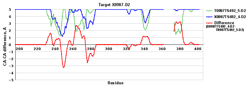 | Red line = (blue line) - (green thick line): difference between the corresponding "Assisted Model"-Target and "Regular Model"-Target CA-CA distances (see above). Negative values show regions where the "assisted" model has better fit to the target than the reference model, i.e. areas of potential improvement. |