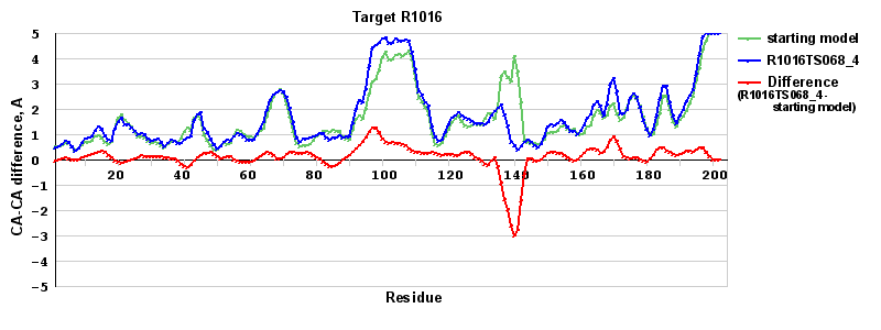 | Red line = (blue line) - (green thick line): difference between the corresponding Refined Model-Target and Starting Model-Target CA-CA distances (see above). Negative values show regions where the reifned model has better fit to the target than the starting model, i.e. areas of potential improvement. |