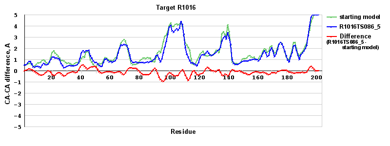 | Red line = (blue line) - (green thick line): difference between the corresponding Refined Model-Target and Starting Model-Target CA-CA distances (see above). Negative values show regions where the reifned model has better fit to the target than the starting model, i.e. areas of potential improvement. |