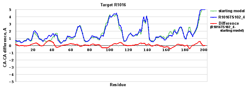 | Red line = (blue line) - (green thick line): difference between the corresponding Refined Model-Target and Starting Model-Target CA-CA distances (see above). Negative values show regions where the reifned model has better fit to the target than the starting model, i.e. areas of potential improvement. |