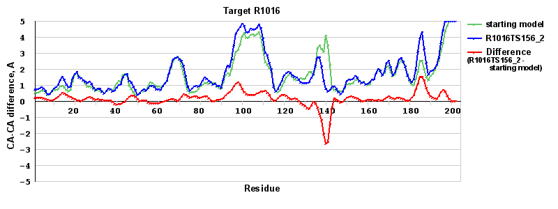 | Red line = (blue line) - (green thick line): difference between the corresponding Refined Model-Target and Starting Model-Target CA-CA distances (see above). Negative values show regions where the reifned model has better fit to the target than the starting model, i.e. areas of potential improvement. |