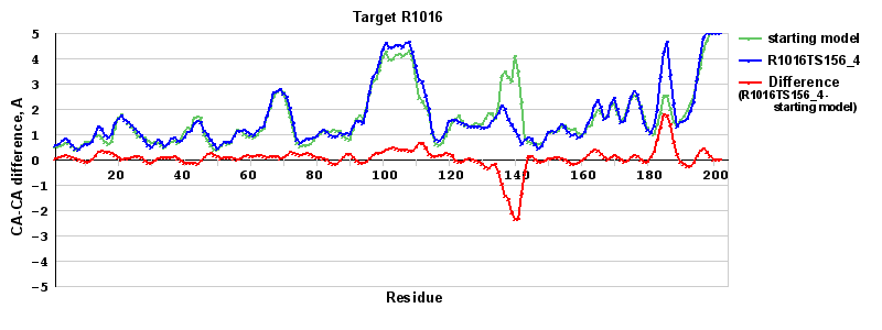 | Red line = (blue line) - (green thick line): difference between the corresponding Refined Model-Target and Starting Model-Target CA-CA distances (see above). Negative values show regions where the reifned model has better fit to the target than the starting model, i.e. areas of potential improvement. |