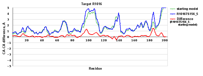 | Red line = (blue line) - (green thick line): difference between the corresponding Refined Model-Target and Starting Model-Target CA-CA distances (see above). Negative values show regions where the reifned model has better fit to the target than the starting model, i.e. areas of potential improvement. |