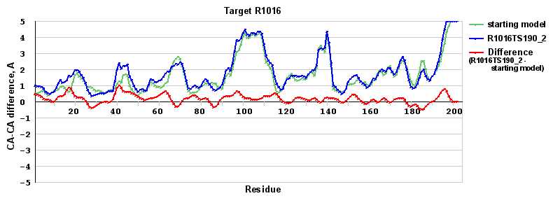 | Red line = (blue line) - (green thick line): difference between the corresponding Refined Model-Target and Starting Model-Target CA-CA distances (see above). Negative values show regions where the reifned model has better fit to the target than the starting model, i.e. areas of potential improvement. |