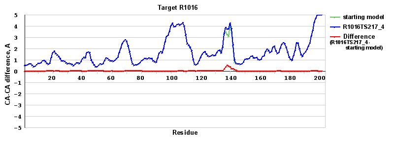 | Green line: distance between the aligned CA atoms in the starting model and the experimental structure in the LGA sequence-independent superposition under the 4A distance cutoff (see LGA description). |