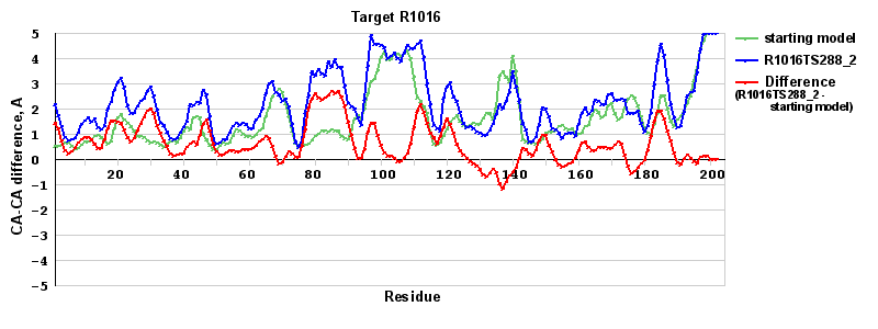 | Red line = (blue line) - (green thick line): difference between the corresponding Refined Model-Target and Starting Model-Target CA-CA distances (see above). Negative values show regions where the reifned model has better fit to the target than the starting model, i.e. areas of potential improvement. |