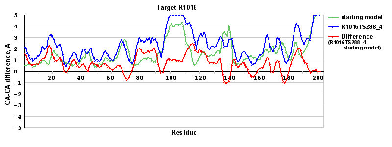 | Red line = (blue line) - (green thick line): difference between the corresponding Refined Model-Target and Starting Model-Target CA-CA distances (see above). Negative values show regions where the reifned model has better fit to the target than the starting model, i.e. areas of potential improvement. |