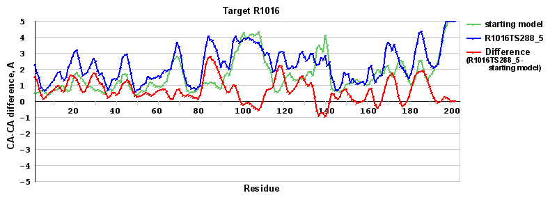 | Red line = (blue line) - (green thick line): difference between the corresponding Refined Model-Target and Starting Model-Target CA-CA distances (see above). Negative values show regions where the reifned model has better fit to the target than the starting model, i.e. areas of potential improvement. |