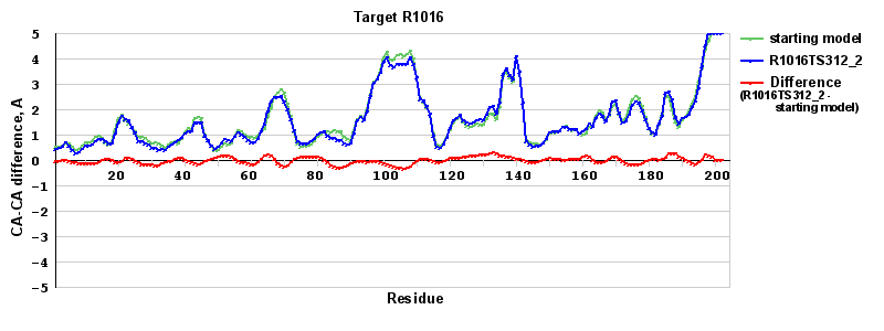 | Red line = (blue line) - (green thick line): difference between the corresponding Refined Model-Target and Starting Model-Target CA-CA distances (see above). Negative values show regions where the reifned model has better fit to the target than the starting model, i.e. areas of potential improvement. |