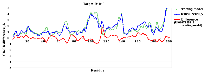 | Red line = (blue line) - (green thick line): difference between the corresponding Refined Model-Target and Starting Model-Target CA-CA distances (see above). Negative values show regions where the reifned model has better fit to the target than the starting model, i.e. areas of potential improvement. |