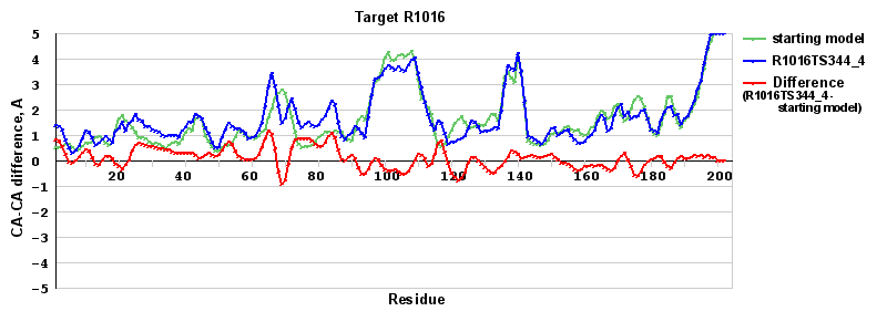 | Red line = (blue line) - (green thick line): difference between the corresponding Refined Model-Target and Starting Model-Target CA-CA distances (see above). Negative values show regions where the reifned model has better fit to the target than the starting model, i.e. areas of potential improvement. |