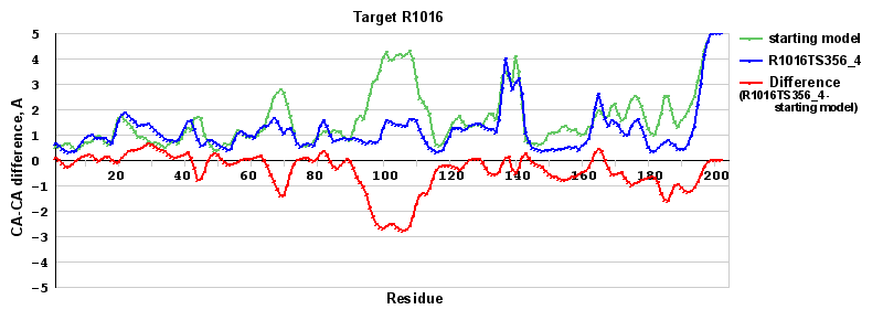 | Red line = (blue line) - (green thick line): difference between the corresponding Refined Model-Target and Starting Model-Target CA-CA distances (see above). Negative values show regions where the reifned model has better fit to the target than the starting model, i.e. areas of potential improvement. |