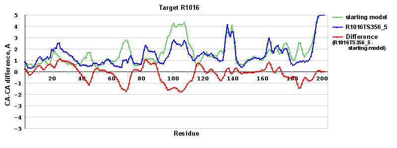 | Red line = (blue line) - (green thick line): difference between the corresponding Refined Model-Target and Starting Model-Target CA-CA distances (see above). Negative values show regions where the reifned model has better fit to the target than the starting model, i.e. areas of potential improvement. |