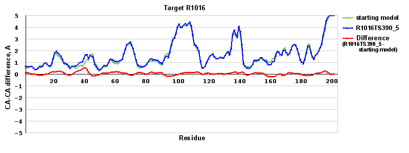 | Red line = (blue line) - (green thick line): difference between the corresponding Refined Model-Target and Starting Model-Target CA-CA distances (see above). Negative values show regions where the reifned model has better fit to the target than the starting model, i.e. areas of potential improvement. |