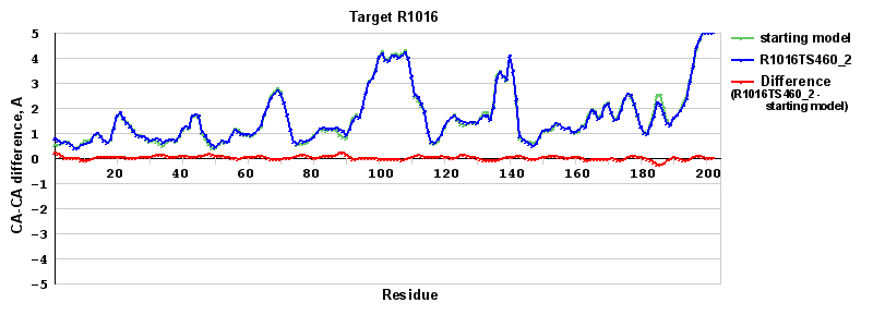| Red line = (blue line) - (green thick line): difference between the corresponding Refined Model-Target and Starting Model-Target CA-CA distances (see above). Negative values show regions where the reifned model has better fit to the target than the starting model, i.e. areas of potential improvement. |